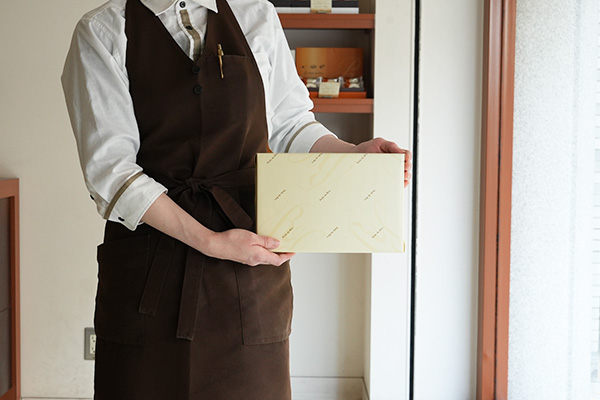 アイボリー色の包装紙に、当店のロゴを小さく印刷をしています。表面には「グロスニス」加工といって、光の当たり方によって当店のシンボルマークがさりげなく光り、高級感と共に上質な印象を与えます。