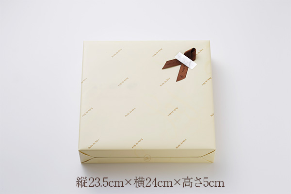 アイボリー色の包装紙に、当店のロゴを小さく印刷をしています。表面には「グロスニス」加工といって、光の当たり方によって当店のシンボルマークがさりげなく光り、高級感と共に上質な印象を与えます。