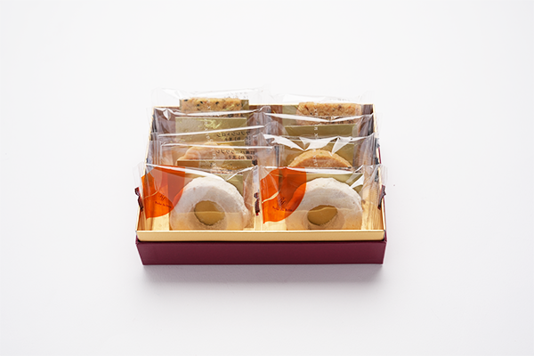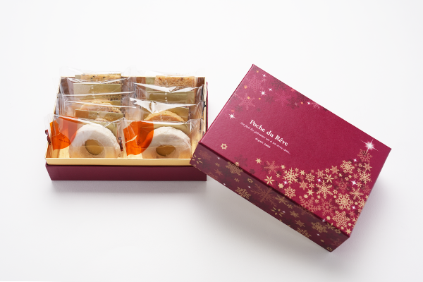 当店オリジナルデザインの冬期限定パッケージに人気No.1和三盆リングサブレ2枚と、7種類のサブレ7枚、合計9枚入ギフトです。