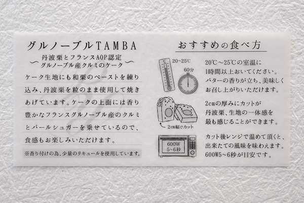 フランスAOP認定のグルノーブル産クルミと、希少な丹波栗をゴロッと贅沢に使用しています。生地にも、熊本産の栗ペーストを練り込み、しっとりとした食感に仕上げています。